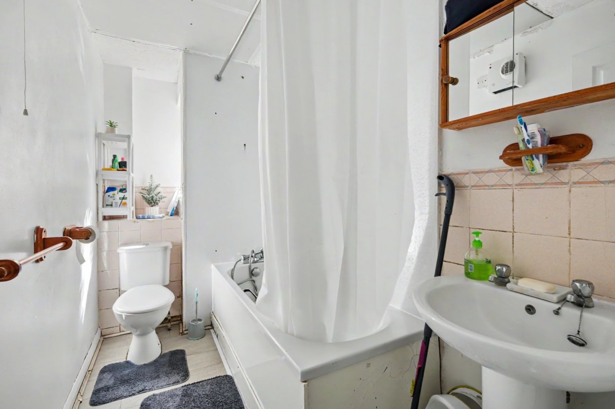 The property is accessed via its own entrance porch, leading into a welcoming hallway with useful storage cupboards. The main living space is a bright and spacious living/dining room, offering plenty of room for both relaxation and entertaining, enhanced by a large window allowing for excellent natural light. The kitchen is fitted with a range of wall and base units, work surfaces and space for appliances, positioned conveniently off the hallway and offering scope for modernisation if desired. There are two bedrooms, including a generous principal bedroom and a further well-sized second bedroom, ideal for guests, children or use as a home office. The accommodation is completed by a bathroom fitted with a suite including bath with shower over, wash basin and WC.