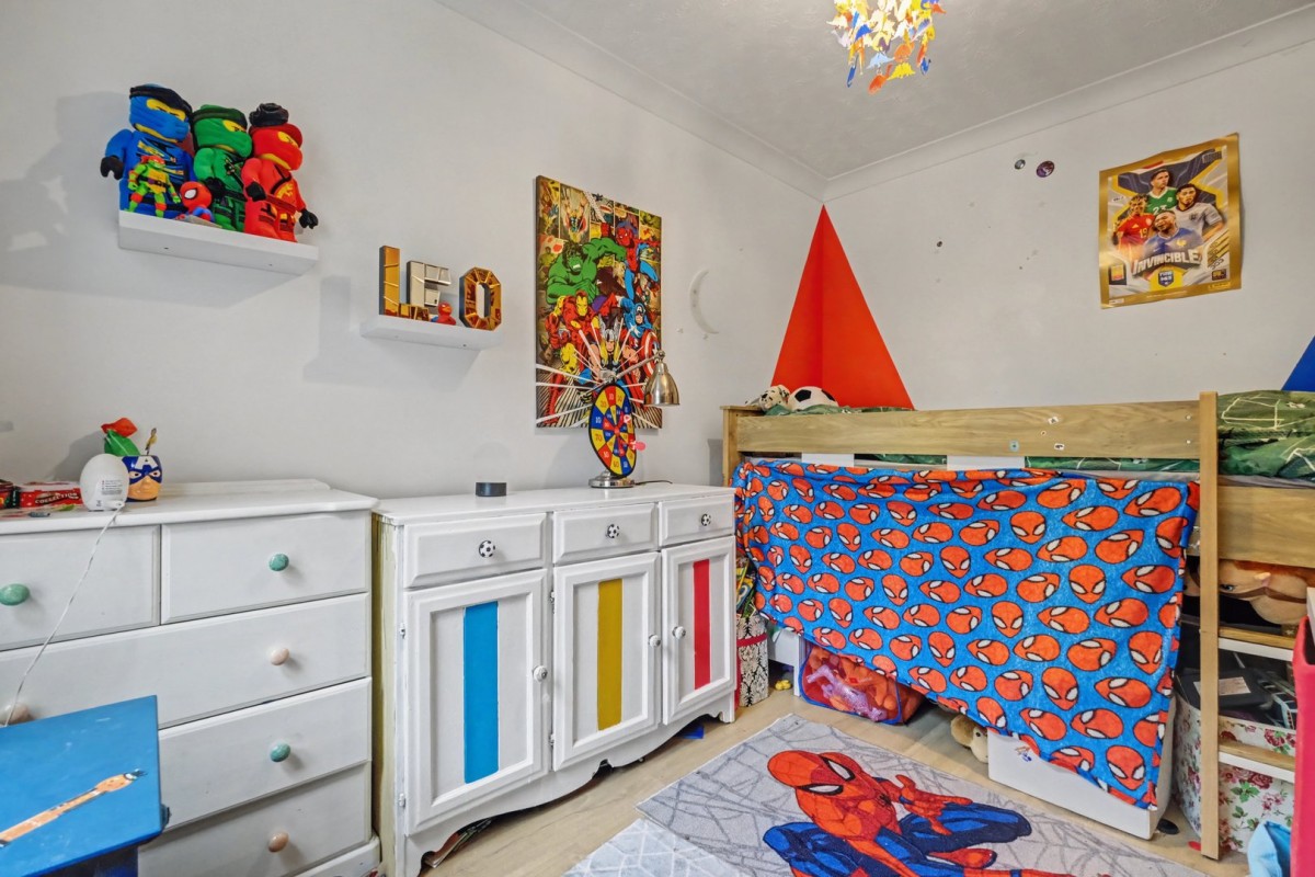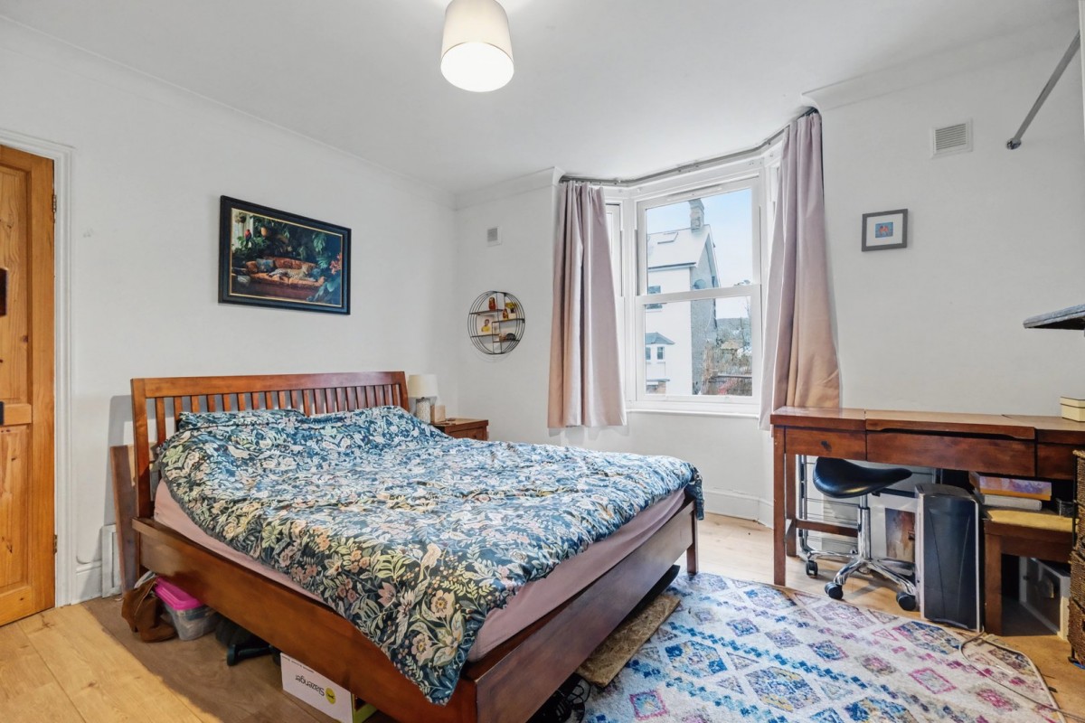 The property is accessed via its own entrance, leading into a central hallway providing access to all rooms. To the front, a generous principal bedroom features a bay window, allowing for excellent natural light and creating a bright and inviting space. A second well-sized bedroom offers flexibility for use as a guest room, nursery or home office.