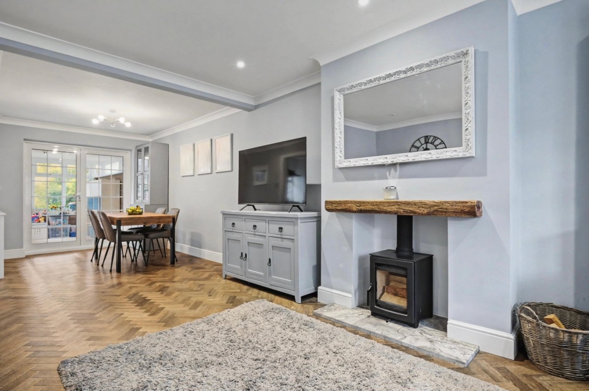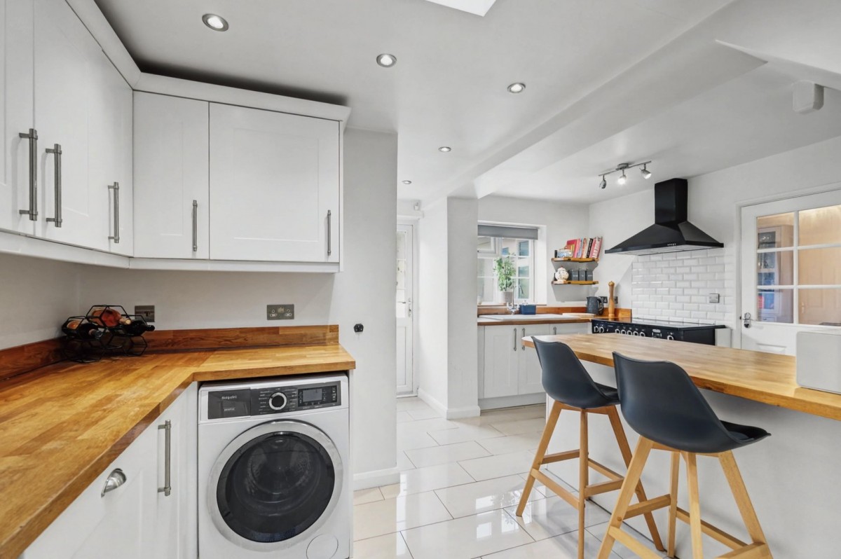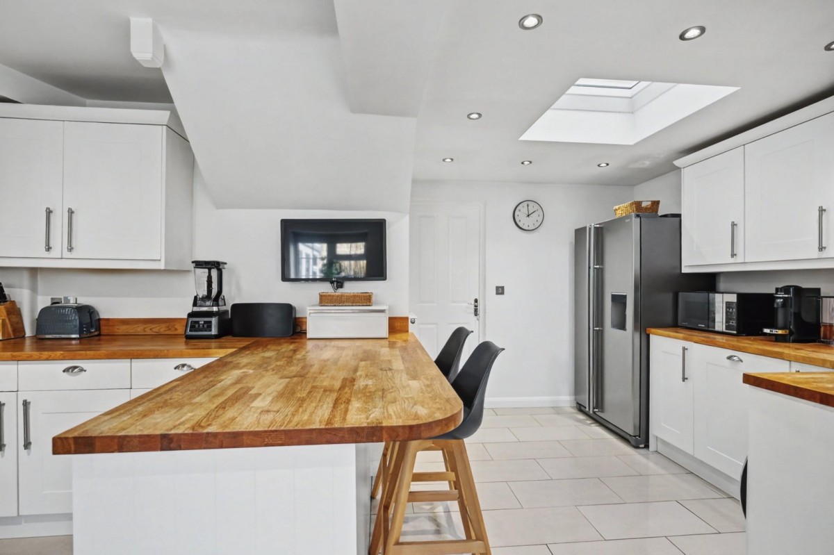 The property has been thoughtfully maintained and combines practical layout with stylish finishes throughout. On the ground floor, the home features a welcoming entrance hall leading through to a generous sitting room with wood burner, providing a bright and comfortable space for everyday living. The dining area offers an ideal setting for family meals and entertaining, with double doors opening into the conservatory, creating a seamless flow of indoor-outdoor living. The conservatory enjoys pleasant garden views and is perfect for use throughout the year. The modern fitted kitchen is a real highlight, featuring contemporary cabinetry complemented by attractive wood block work surfaces and ample space for appliances. A useful ground floor WC adds further convenience. From the kitchen there is access to the part converted garage offering excellent additional storage.