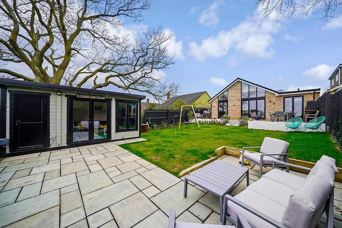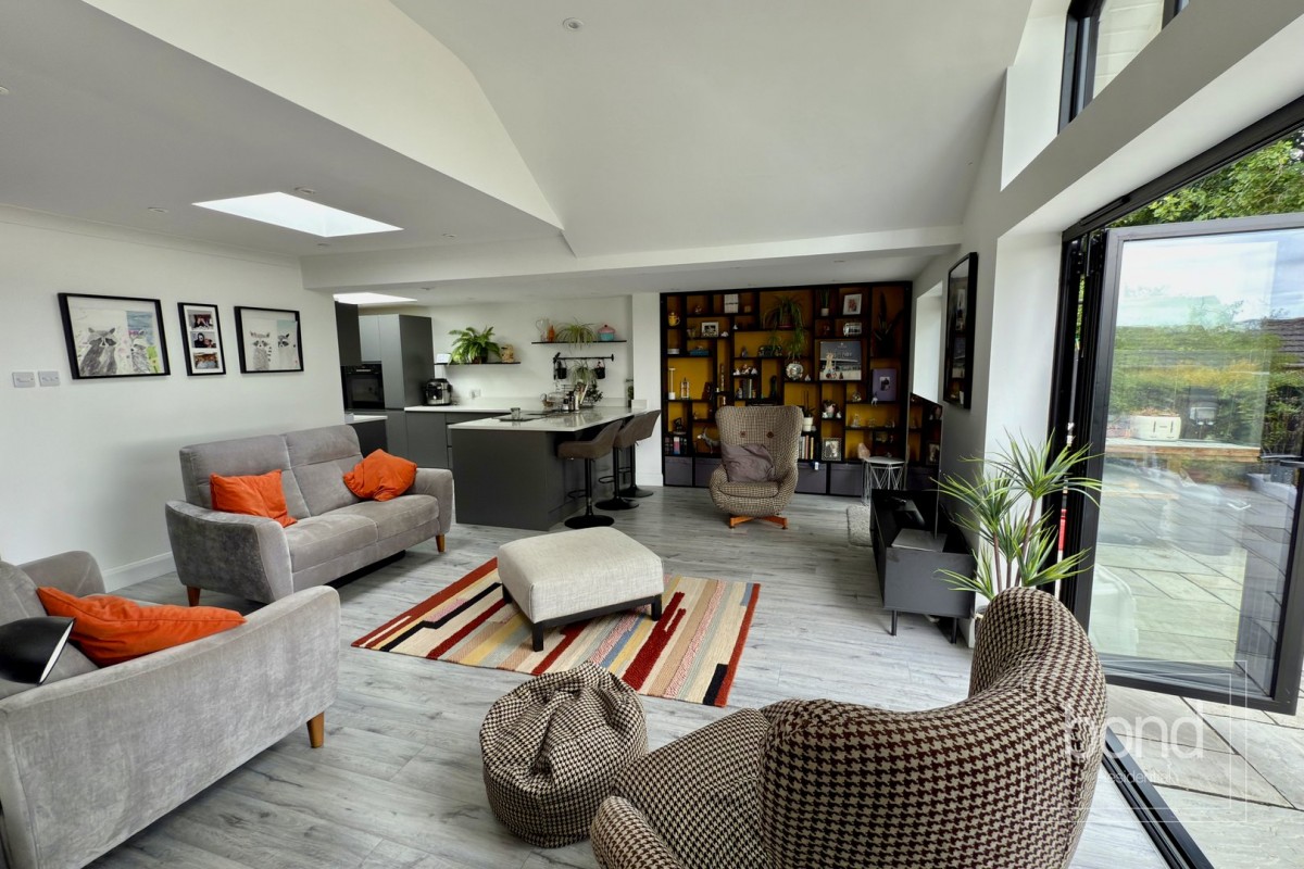 Entering the bungalow via a side entrance door you enter an l-shaped entrance hall which provides access to four bedrooms, bathroom and study/home office. All four bedrooms feature fitted storage solutions and the principal bedroom benefits from an en-suite shower in addition to the main family bathroom which serves the remaining bedrooms. The hall opens seamlessly into the recent extension which provides a stunning open plan living/dining/kitchen space perfect for modern day family living complete with underfloor heating and three openings which include central bi-fold doors and link the inside seamlessly with the outside. The kitchen area extends into a useful utility room and is fitted with modern grey handleless units with quartz worktops. Integrated appliances include an induction hob, twin electric ovens, dishwasher and boiling water tap.