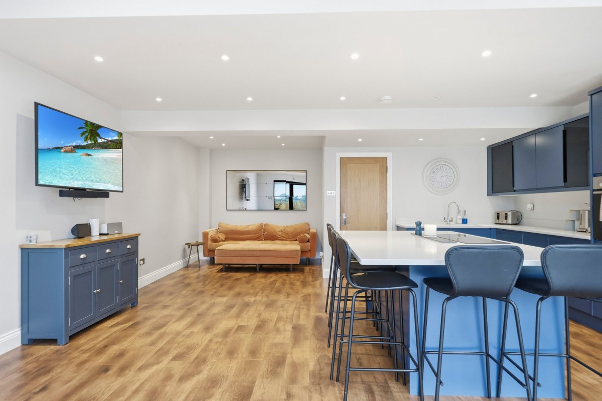 The comfortable living room provides an ideal space for movie nights or quiet reading. The heart of the home is the impressive open-plan kitchen, dining, and family room, complete with a central island, integrated appliances, and bi-folding doors that open onto and overlook the rear garden. A utility room has been created by partially converting the garage, offering a far more practical use of space.