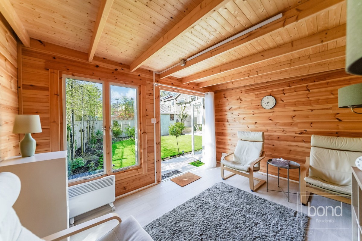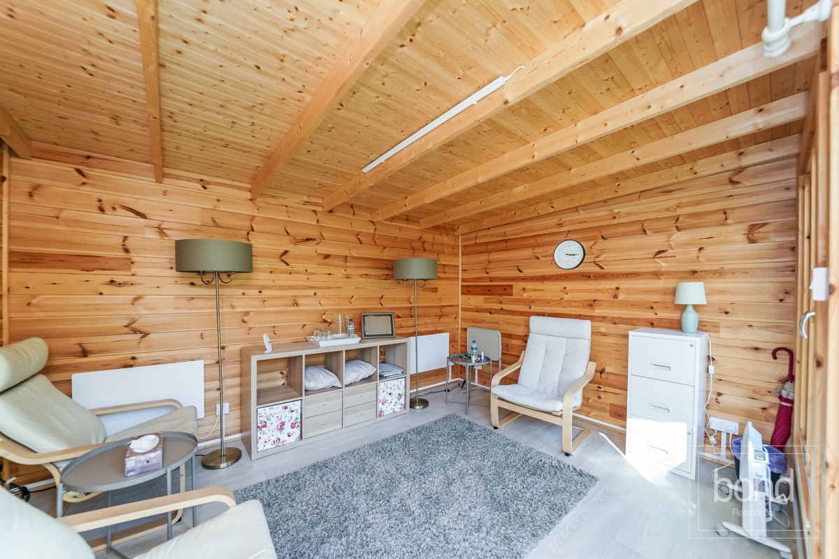 Outside to the front of the property there is driveway parking with an adjacent lawned garden and gated side access. The rear garden has been beautifully landscaped by the current owner and enjoys a southerly aspect. Measuring approximately 40ft x 40ft the garden features a porcelain patio and lawned garden with flower and shrub beds. and timber storage shed. In addition there is a purpose built garden room which is fully insulated and features electric heating with double glazed windows and patio doors.