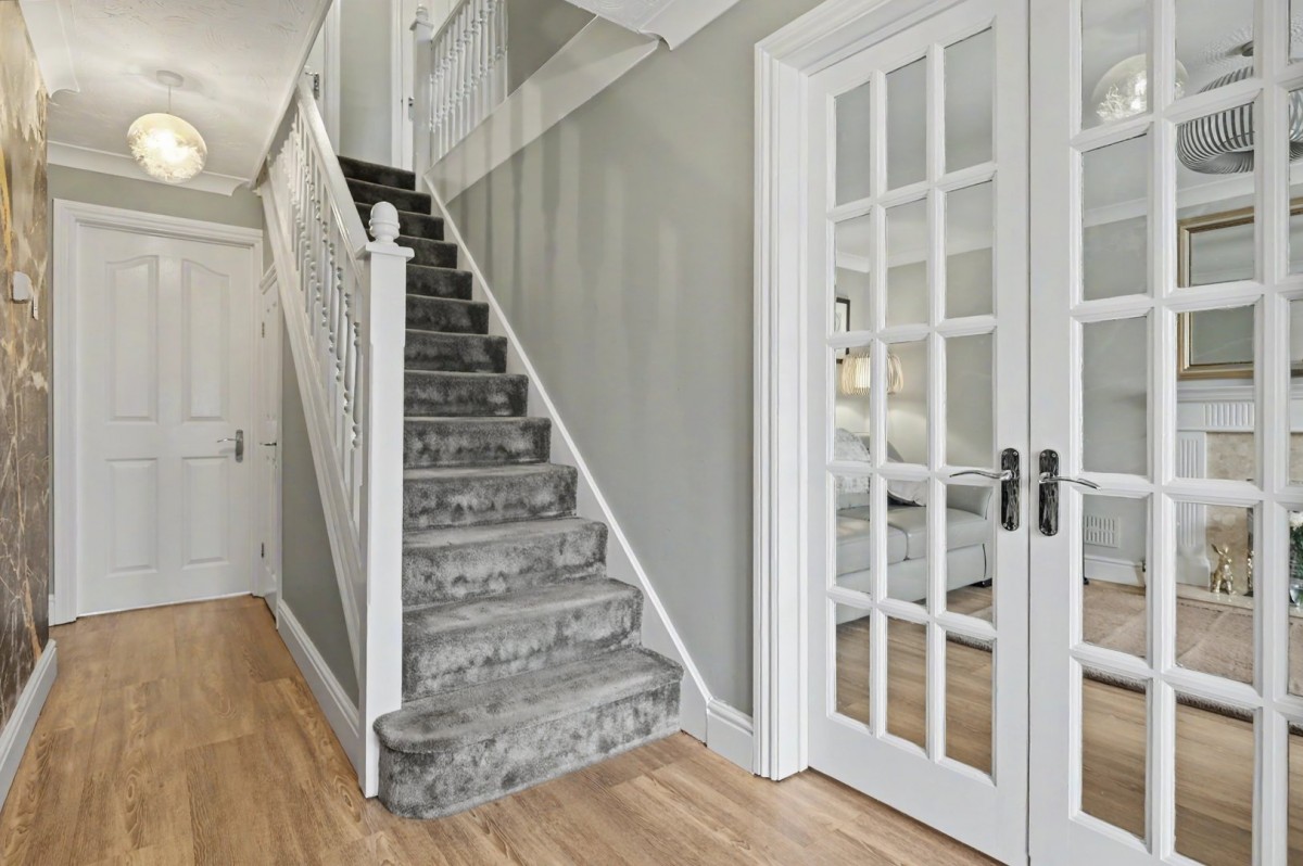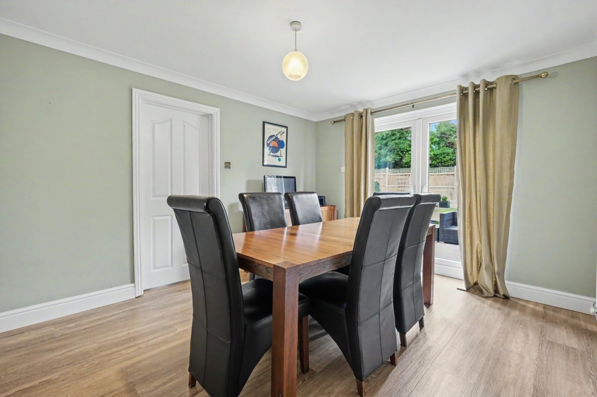 The ground floor is thoughtfully arranged, beginning with a welcoming entrance hall and ground floor cloakroom. To the front, a spacious sitting room provides a comfortable and inviting reception space, ideal for relaxing or entertaining guests. Double doors lead through to a separate dining room, creating a flexible layout for both formal and informal occasions.