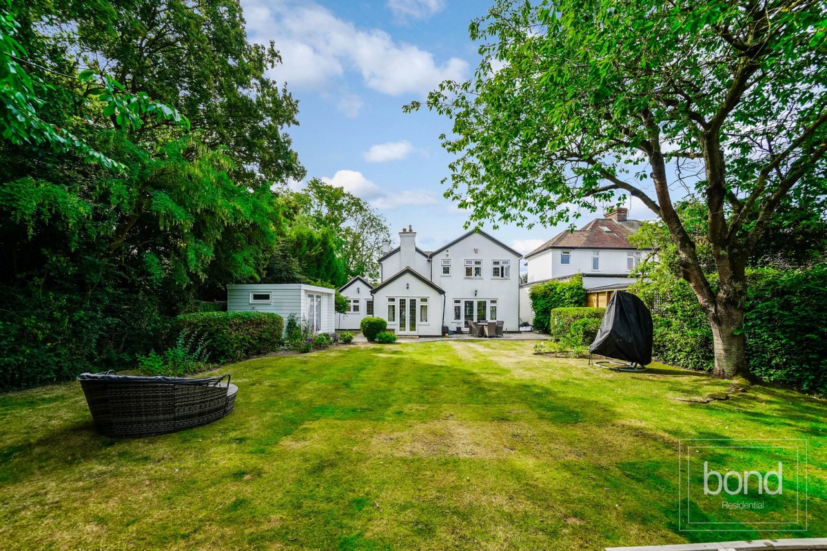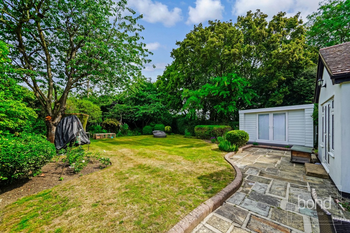 Outside, the property continues to impress. To the front, a large gravel driveway provides off-road parking for multiple vehicles. The generous rear garden offers a well-maintained lawn, mature borders, a paved patio area for alfresco dining, and a detached garden room, ideal for year-round use.