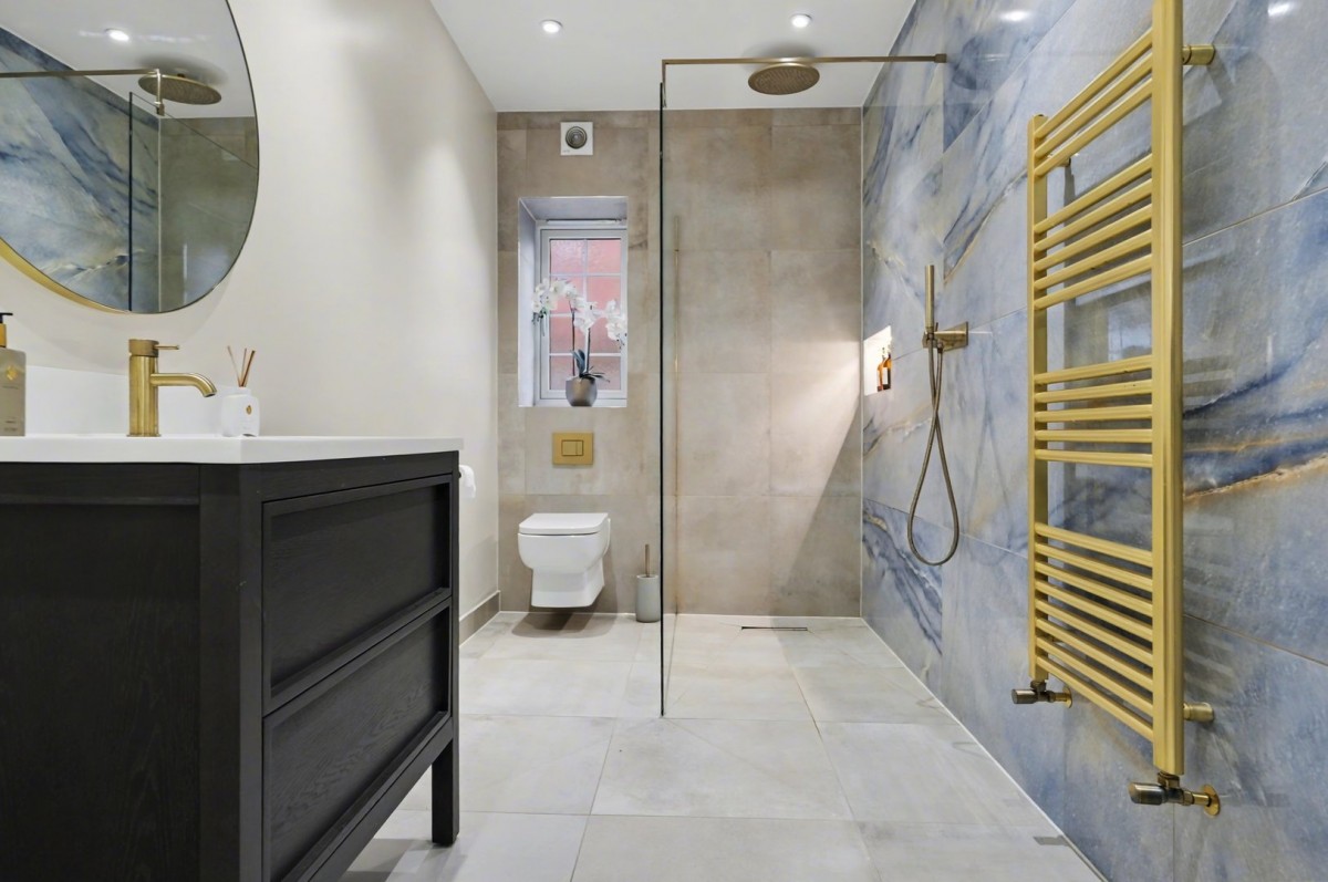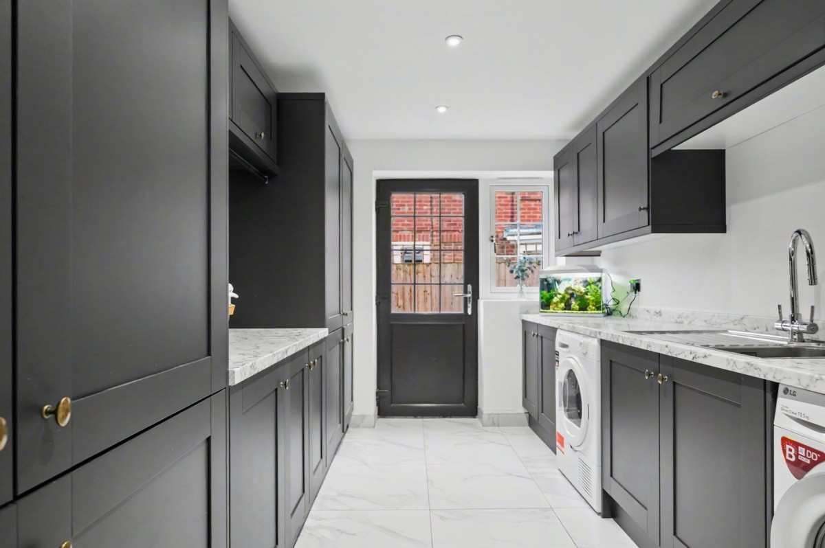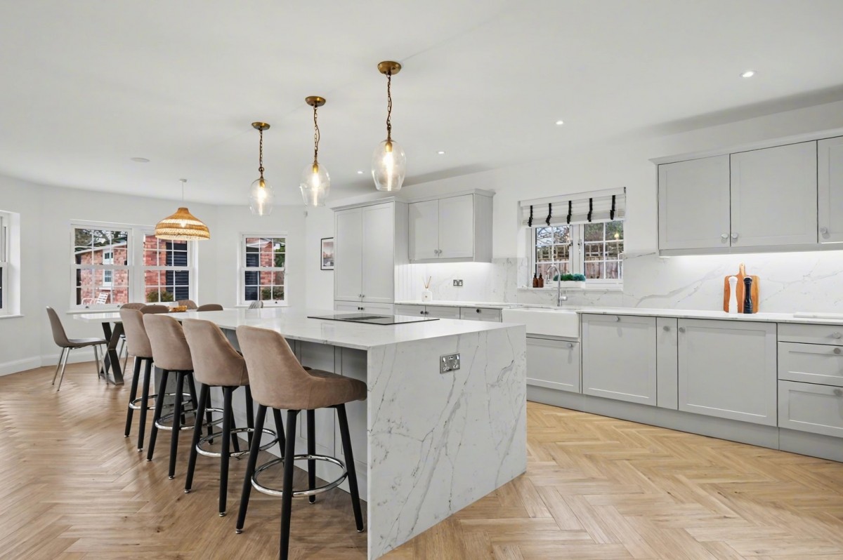 The journey through the home begins with an impressive and striking entrance hall, which immediately sets the tone and creates a real sense of arrival upon entering the property. The ground floor accommodation is both versatile and well planned, comprising a bedroom/home office, elegant sitting room, children’s playroom, utility room, and a luxury fitted shower room. These rooms lead through to the truly exceptional open-plan kitchen, dining, and family room, accessed via double doors from the entrance hall. This outstanding space is flooded with natural light from large floor-to-ceiling sliding doors and a skylight, creating a bright and welcoming environment. The kitchen is finished to an exceptionally high standard, featuring a range of integrated appliances and a central island. The dining area is perfectly positioned within a thoughtful bay, offering delightful views over the rear garden. The family seating area provides a luxurious place to relax, with a well-designed media unit delivering a seamless and clean viewing experience for entertainment and sport alike.